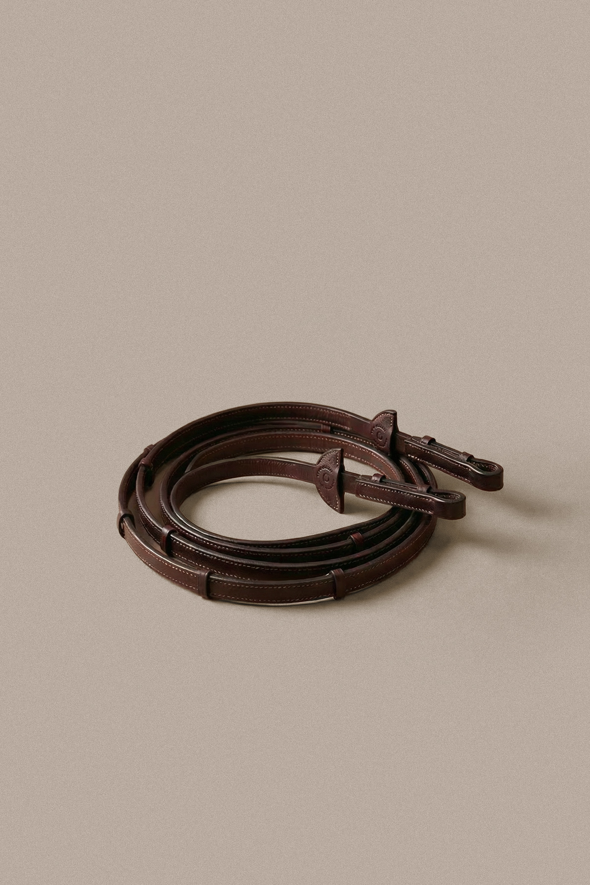 The integrated leather stoppers ensure consistent hand placement and a secure feel, allowing for precise communication between horse and rider. Soft yet resilient, the rubber provides excellent grip even in wet conditions, while the polished silver buckles and contrasting white stitching mirror the elegant design of the Goyer Sellier Classic collection.