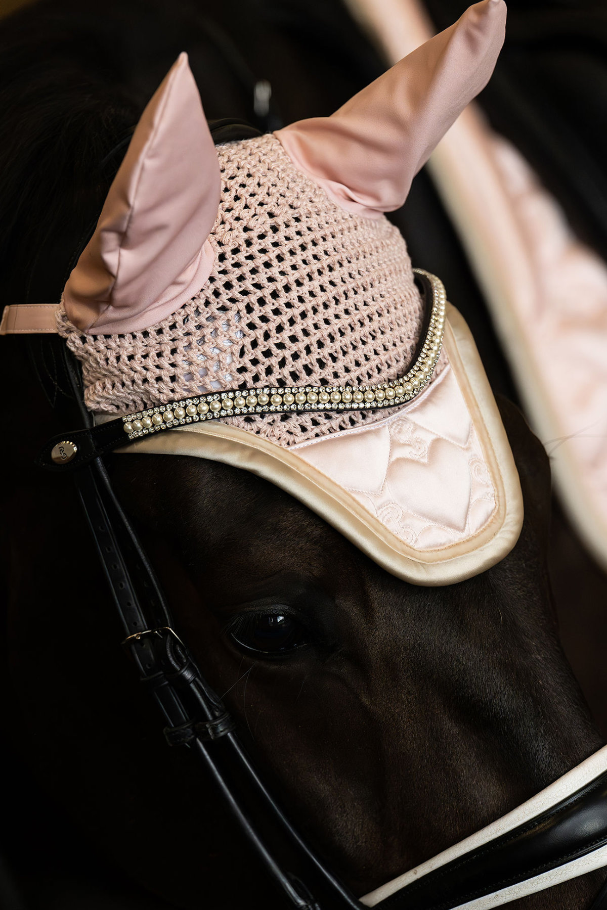 A discreet Velcro fastening keeps the bonnet securely in place under the bridle, ensuring stability even during active rides. Finished in the elegant Whipped Pink color, this ear bonnet pairs beautifully with the matching Heart saddle pad, creating a coordinated and stylish look in the arena.