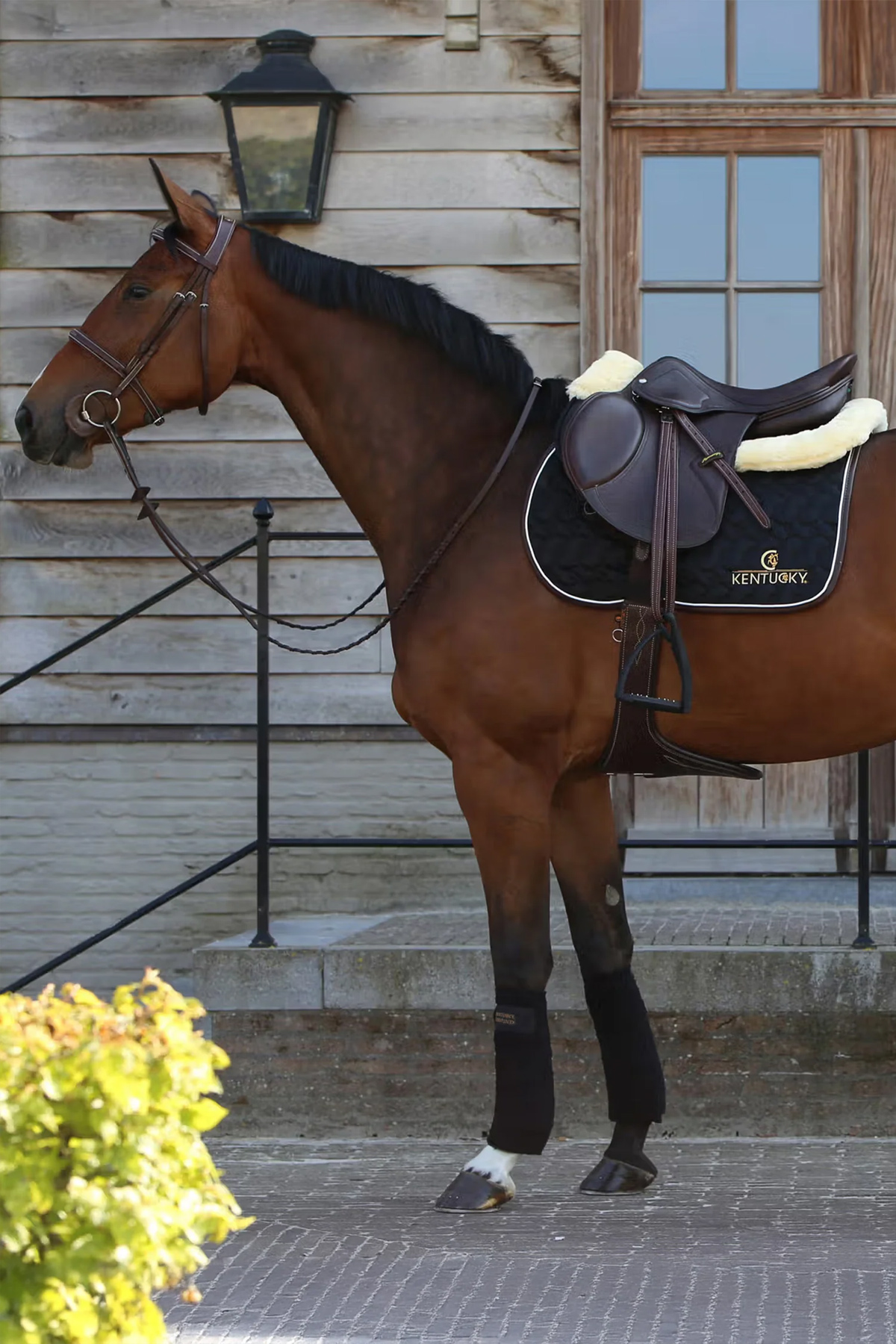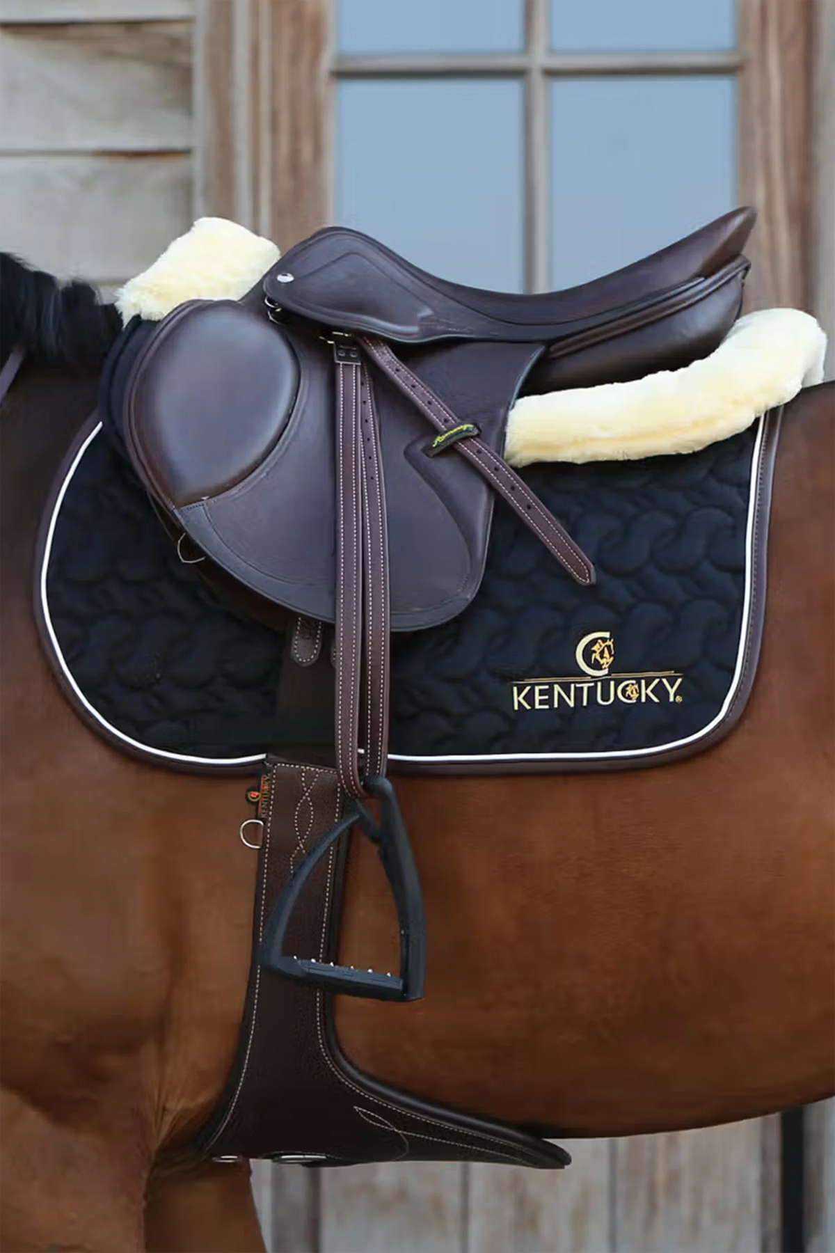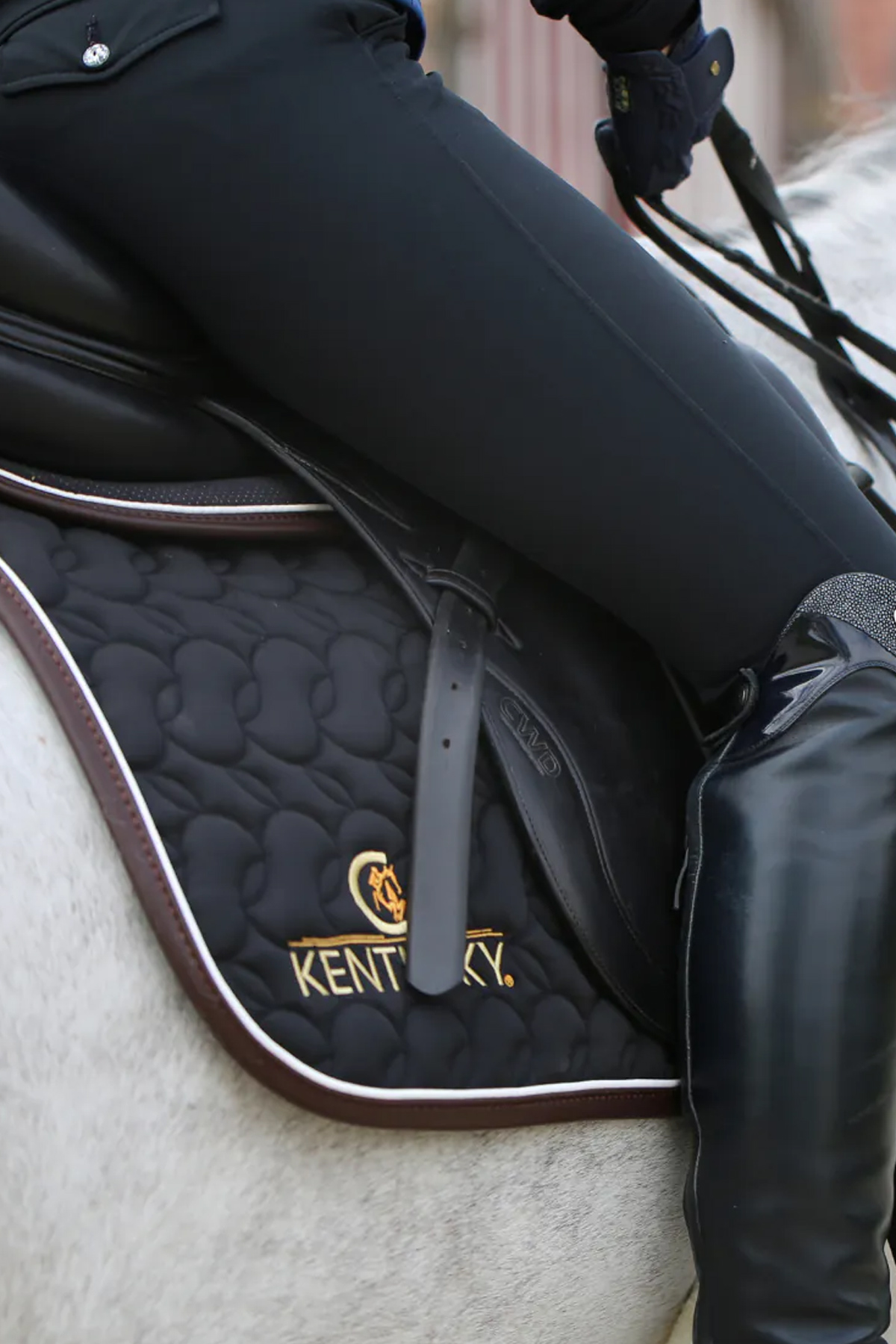The saddle pad’s artificial leather edges give a refined, polished look, complemented by the embroidered Kentucky logo on both sides, adding a subtle touch of elegance. With only girth straps and no saddle straps, it offers a clean design while keeping the pad securely in place during jumping, dressage, or eventing. Its versatile design and original pattern make it equally suitable for high-intensity training or competition, giving both horse and rider confidence in every stride.