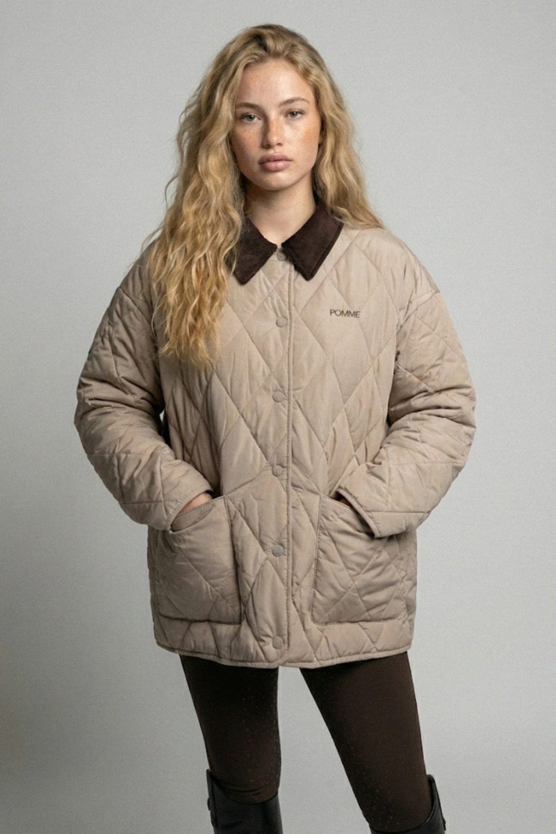Crafted in a soft beige diamond-quilted fabric, the jacket provides lightweight warmth ideal for transitional seasons. The contrasting corduroy collar adds durability and a heritage-inspired touch, while the clean button-down front and deep patch pockets ensure everyday practicality—perfect for keeping essentials close at hand. A subtle embroidered logo on the chest completes the design with a quiet mark of quality.